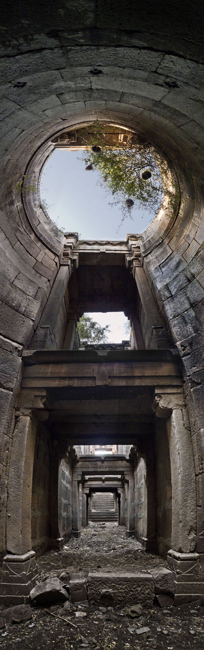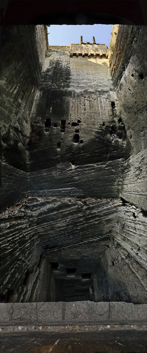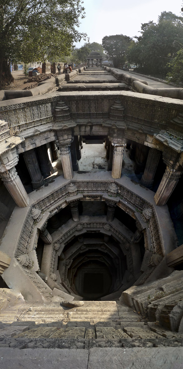 Hoe werden deze omgekeerde tempels gebouwd? Sommige putten lijken simpelweg uitgehakt: de wanden van de rots vormen de schacht, hier en daar gesteund door een gemetselde muur. Andere putten zien eruit als manden gevlochten van steen, nesten zoals wevervogels die maken. En weer andere stepwells lijken gebouwen die op hun kop zijn geland en zich in de grond vastbeten.